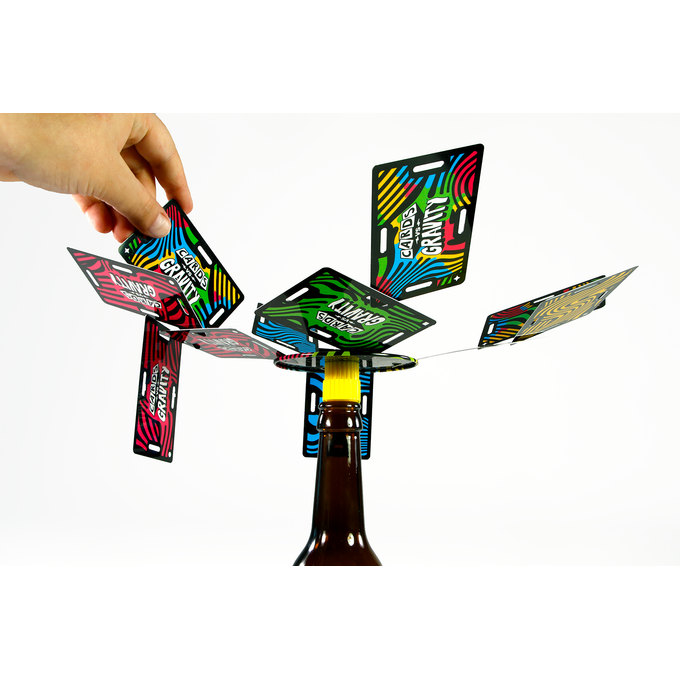 In Cards vs Gravity balanceer je kaarten op een fles. Een magnetische schijf houdt de boel redelijk lang in evenwicht. Elke beurt pak je een kaart en steek je die in een kaart van dezelfde kleur of hang je die eraan. Valt er niets, dan is de volgende speler aan de beurt. Vallen er wel kaarten van de fles, dan krijg je daar strafpunten voor. Wie aan het einde van het spel de minste strafpunten heeft, verslaat niet alleen de zwaartekracht, maar ook zijn medespelers!