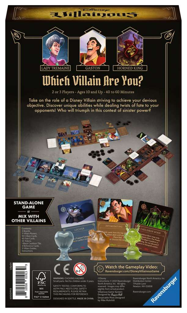 In Disney Villainous, players take the role of a Disney Villain. The first player to complete their Villain's untie, story-based objective wins! Use henchmen and items from your Villain deck to help you along the way. Meanwhile, deal twists of fate to your opponents along the way by playing meddlesome heroes, who interfere with Villains' plans. Who will win this ultimate contest of sinister power? To win as Gaston, players must remove Obstacles in his Realm to convince Belle he’s the perfect man. The Horned King must have Cauldron Born in each location to control the world, while Lady Tremaine must marry Drizella or Anastasia to the Prince to achieve victory. Previous games in the Disney Villainous family include The Worst Takes it All, Evil Comes Prepared, Perfectly Wretched.