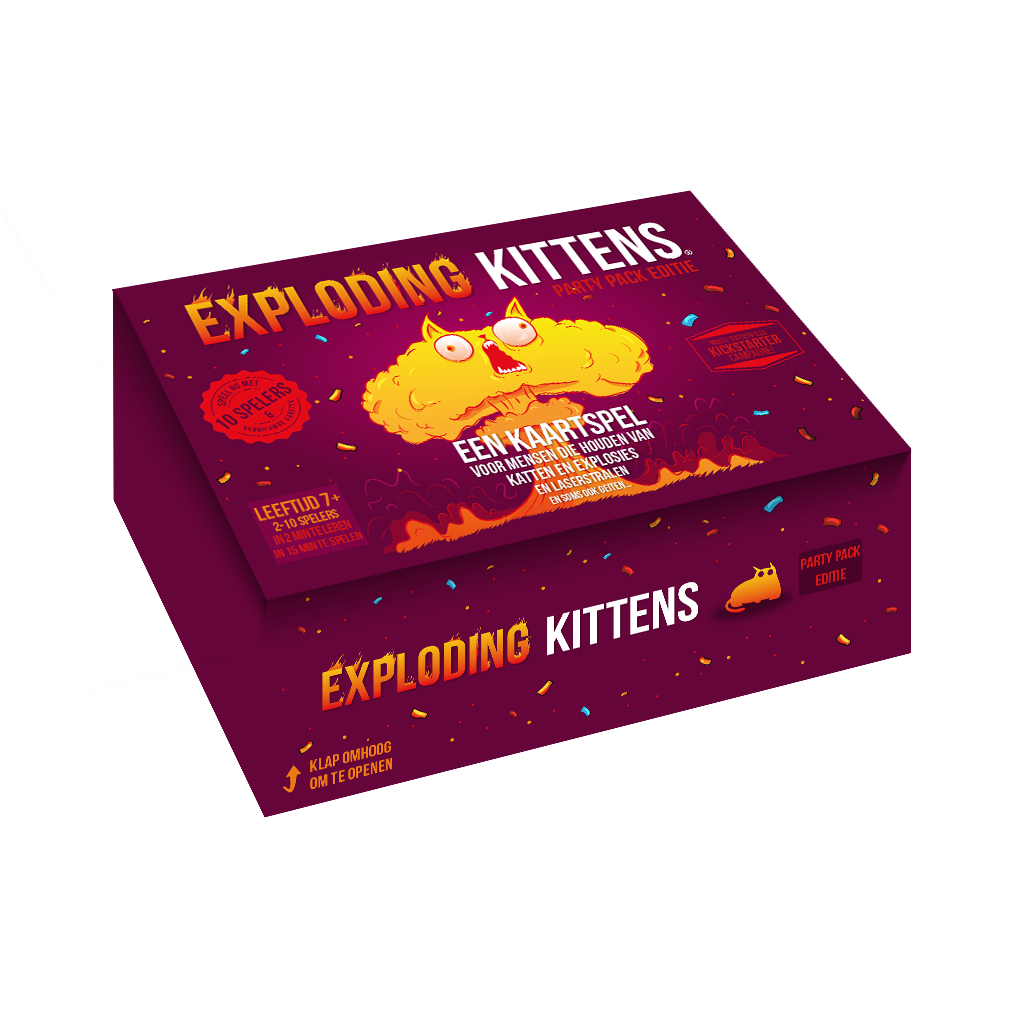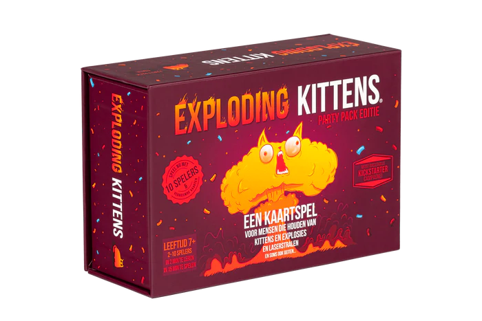 Exploding Kittens: Party Pack Edition is een zeer strategische, door katten aangedreven versie van Russisch Roulette die tot 10 spelers kan ondersteunen. Spelers trekken kaarten totdat iemand een Exploding Kitten trekt, waarna ze ontploffen en uit het spel zijn. Om ontploffen te voorkomen, kunnen ze het katje onschadelijk maken met een laserpointer of kattenkruidsandwich, OF krachtige actiekaarten gebruiken om het ontploffende katje te verplaatsen of te ontwijken. Verraad je vrienden. Probeer niet te ontploffen. De laatste speler die nog in leven is, wint.