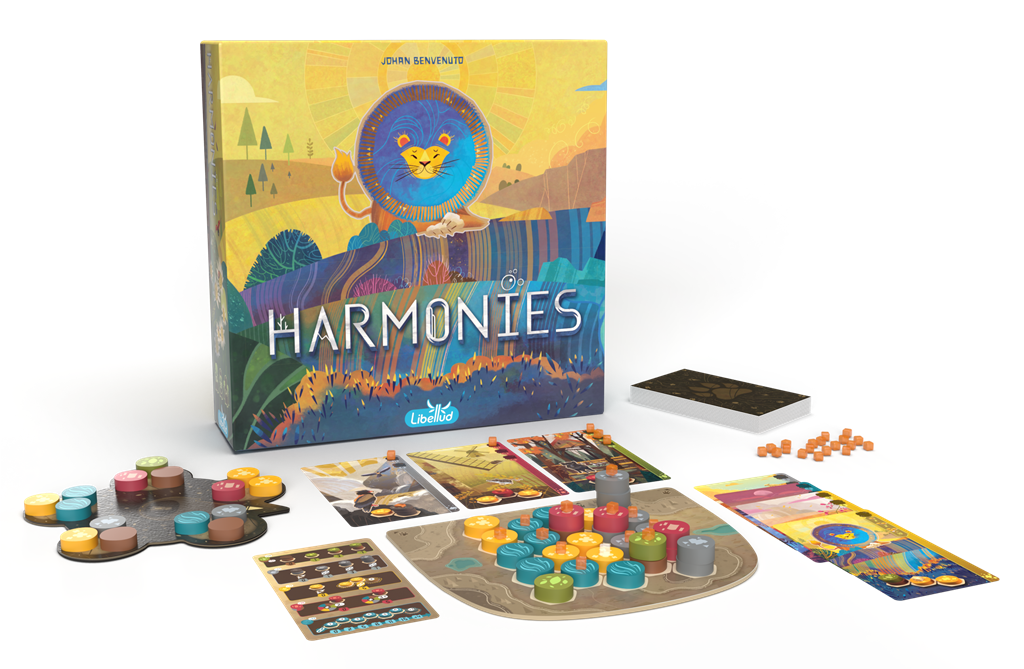 In Harmonies bouw je een landschap op je bord door sets van 3 fiches te plaatsen en bossen, bergen, velden en steden te maken.
