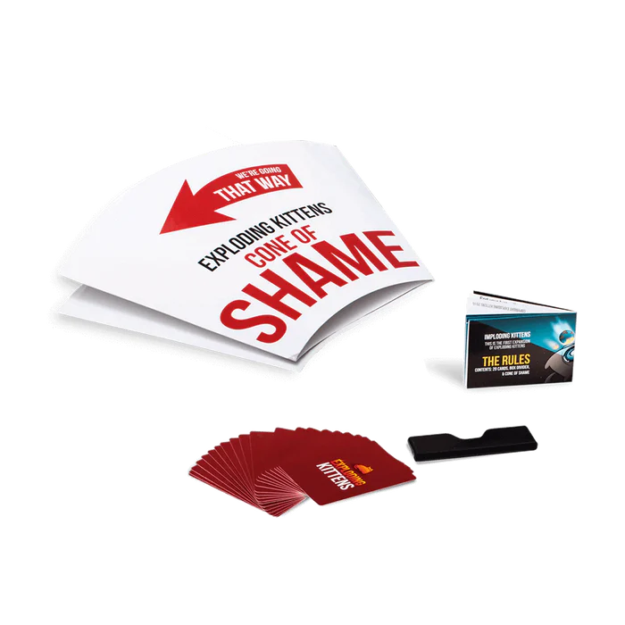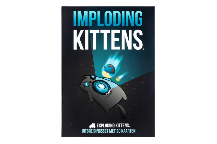 Dit is de eerste uitbreiding van Exploding Kittens. Met deze uitbreiding kun je niet alleen met maximaal 6 spelers spelen, het introduceert ook 20 nieuwe kaarten. Een van die kaarten is de Imploderende Kitten, die open in de stapel wordt geplaatst en bij het trekken leidt tot een onvermijdelijke explosie. Je kunt een imploderend kitten NIET onschadelijk maken. Bovendien wordt de game geleverd met een Cone of Shame-richtingaanwijzer op mensenmaat.