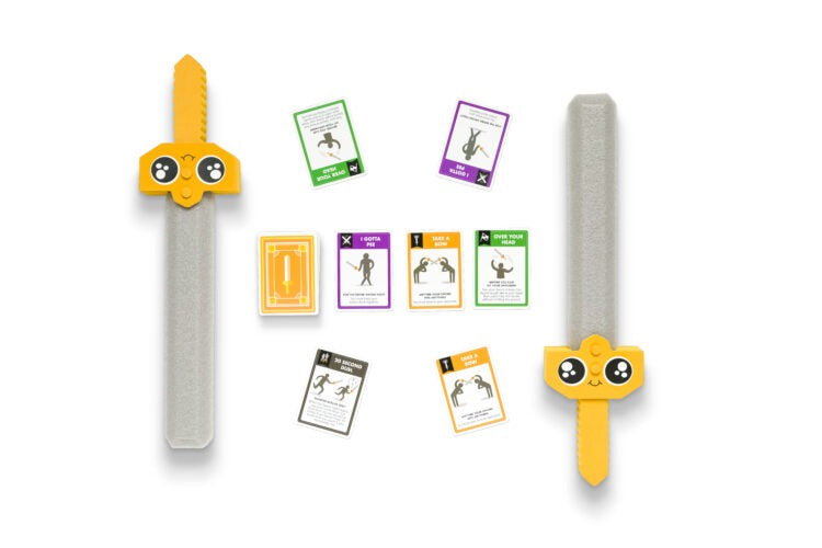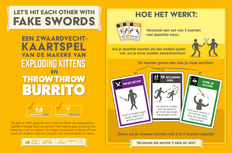 Dit kaartspelgevecht, met een schuimrubberen zwaard, is van de makers van Exploding kittens en Throw Throw Burrito. Verwacht je dus zeker aan knotsgekke toestanden. Het spel is 100% geschikt voor zowel kinderen als volwassenen. Leeftijd en lengte doen er niet toe. Je hebt ook geen ervaring nodig in het het zwaardvechten. De enige voorwaarde is dat je het leuk vindt om anderen met een zwaard (van schuimrubber) te raken.