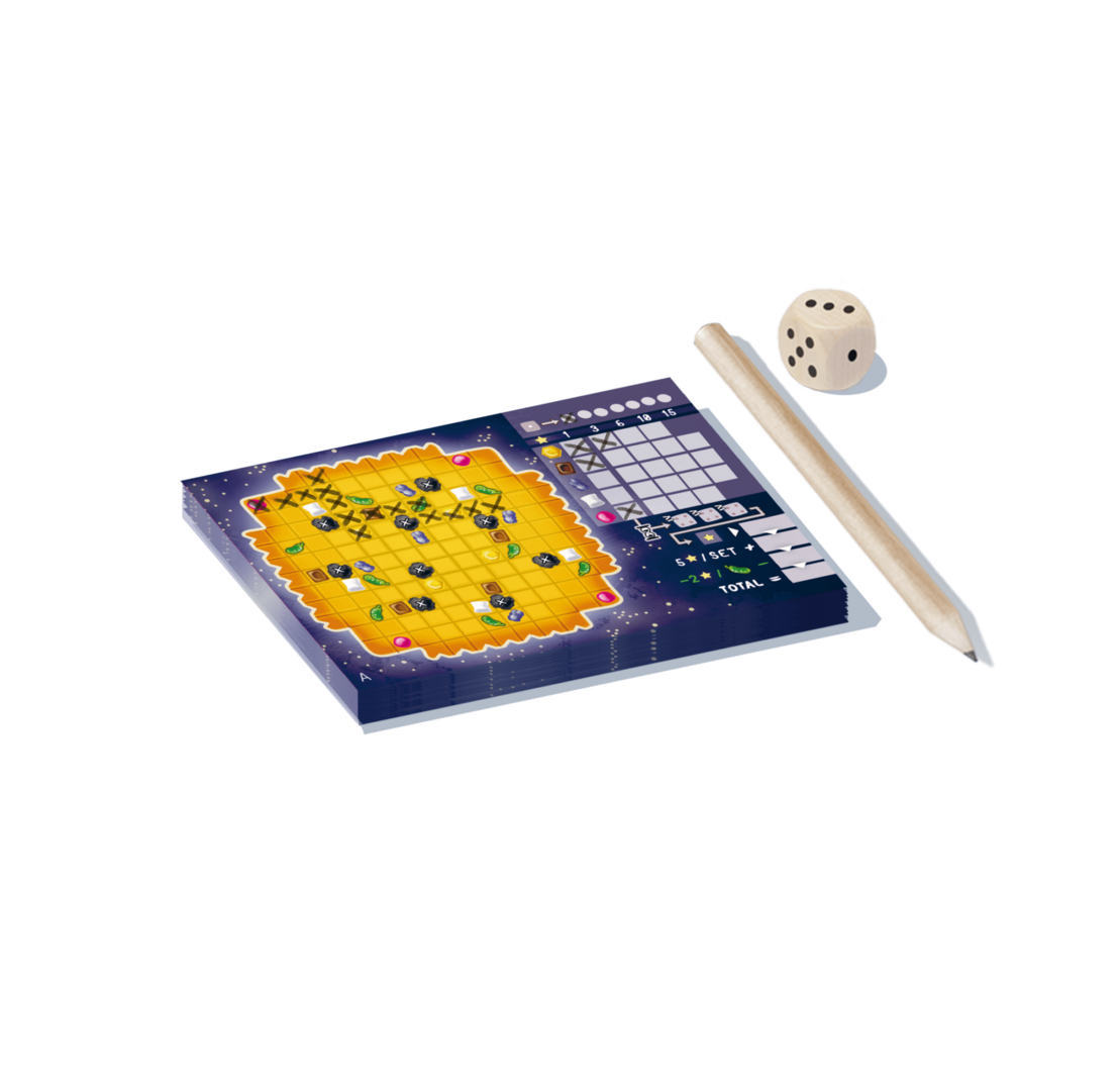 Wie beweert dat de maan van kaas is gemaakt, heeft het bij het verkeerde eind – de maan zit vol met lekkernijen! Je graaft tunnels in de maan in de hoop al die lekkernijen te kunnen bemachtigen. De dobbelsteen is je boor. Hoe hoger de worp, hoe dieper je mag graven. Maar je krijgt de lekkernijen alleen door heel nauwkeurig te graven.