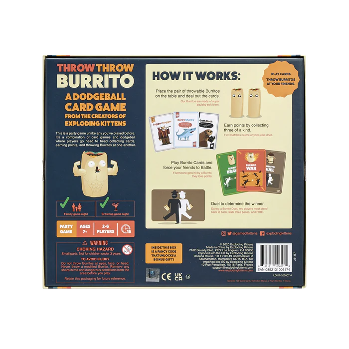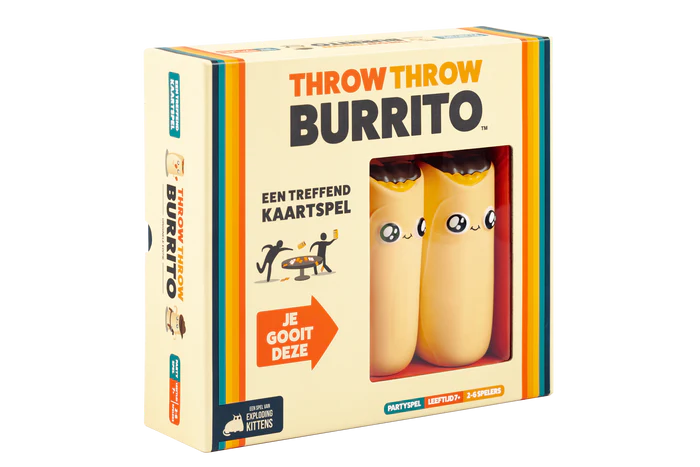 Plaats het paar werpbare burrito's op tafel en deel de kaarten uit. Verdien punten door three of a kind te verzamelen. Speel Burrito Cards en dwing je vrienden om te vechten. Dueleer om de winnaar te bepalen. Ontwijk en duik voor de squishy burrito's in de lucht of word geraakt en ontvang een Burrito Bruise!