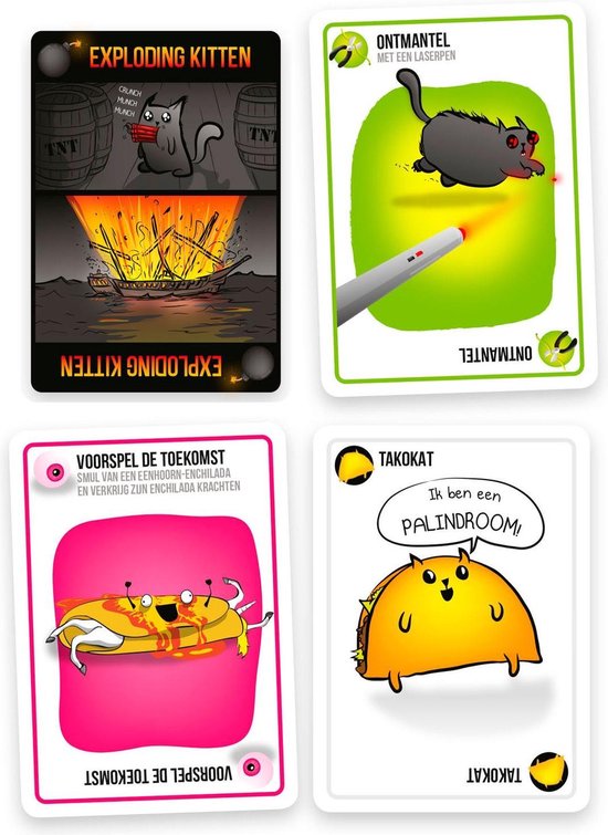Dit tactische spel is een variant van Russisch roulette, maar dan met exploderende kittens. Je neemt kaarten van de stapel totdat je één van de gevreesde exploderende kittens trekt. Dan heb je meteen verloren. Met alle andere kaarten kun je jezelf verdedigen, aanvallen, een beurt overslaan of de katten afleiden.