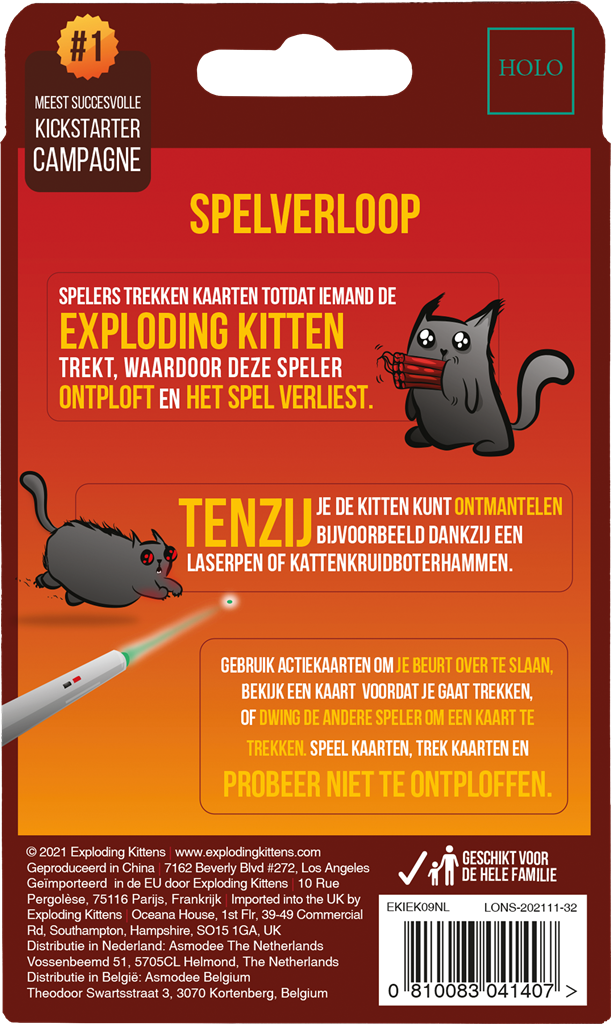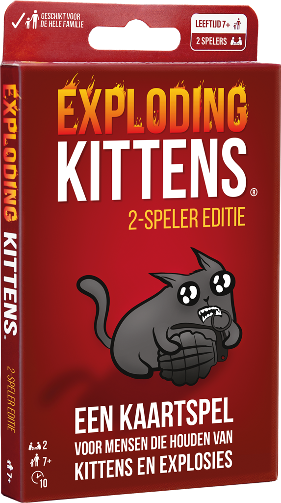 Exploding Kittens: 2-Player Edition is een zeer strategische, kitty-aangedreven versie van Russian Roulette, kleiner, reisvriendelijker en compacter om mee te nemen. Spelers trekken kaarten totdat iemand een Exploding Kitten trekt, waarna ze ontploffen en uit het spel zijn. Om ontploffen te voorkomen, kunnen ze het katje onschadelijk maken met een laserpointer of kattenkruidsandwich, OF krachtige actiekaarten gebruiken om het ontploffende katje te verplaatsen of te ontwijken. Neem het op tegen je tegenstander in deze voor twee gemaakte editie van de hitgame.