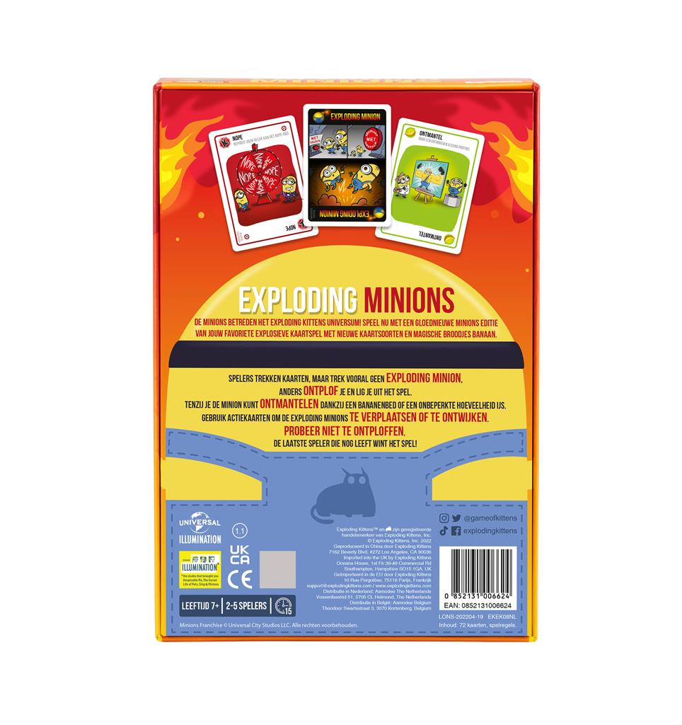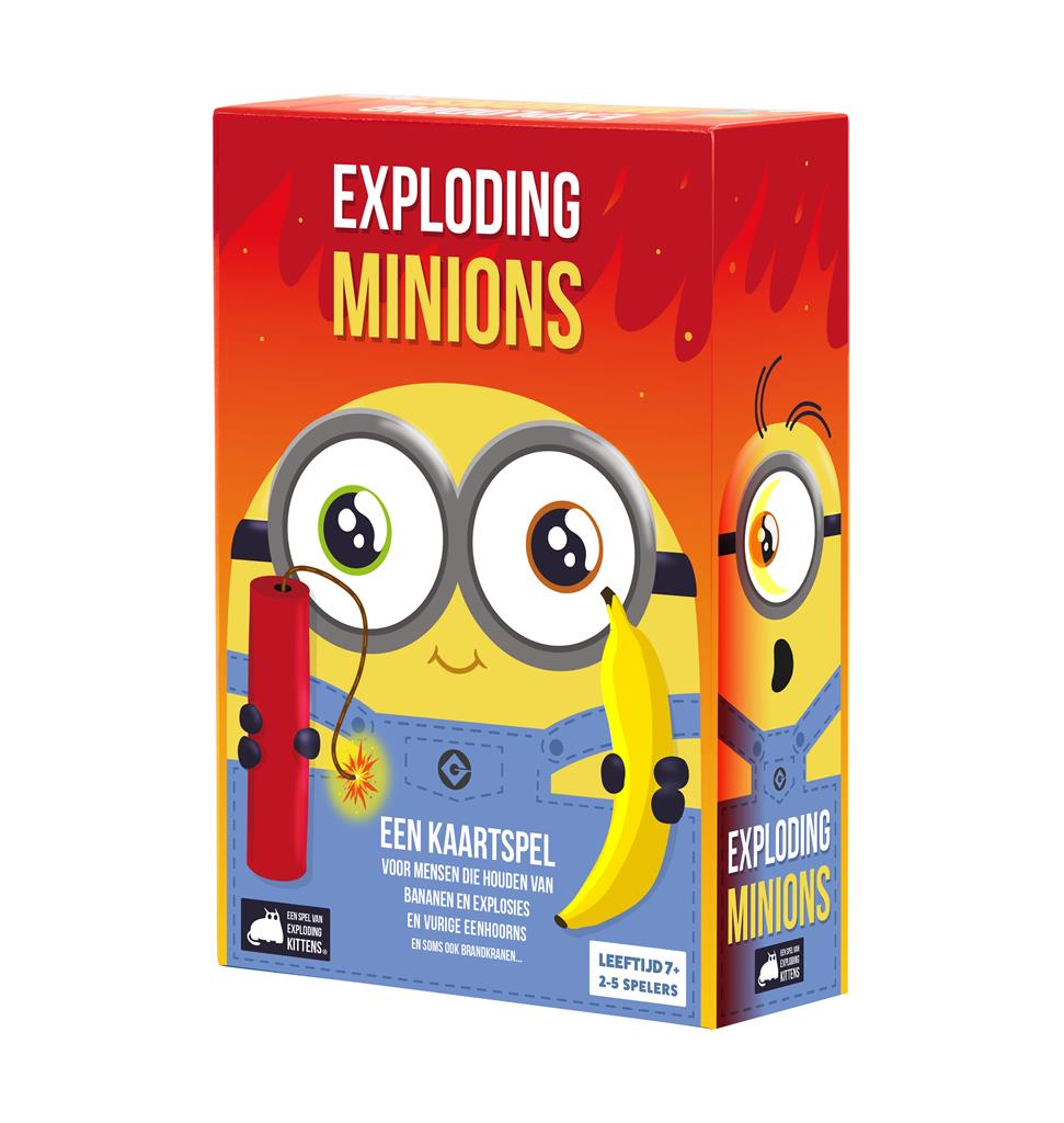 De Minions betreden het Exploding Kittens universum! Speel nu met een gloednieuwe Minions editie van jouw favoriete explosieve kaartspel met nieuwe kaartsoorten en magische broodjes banaan.