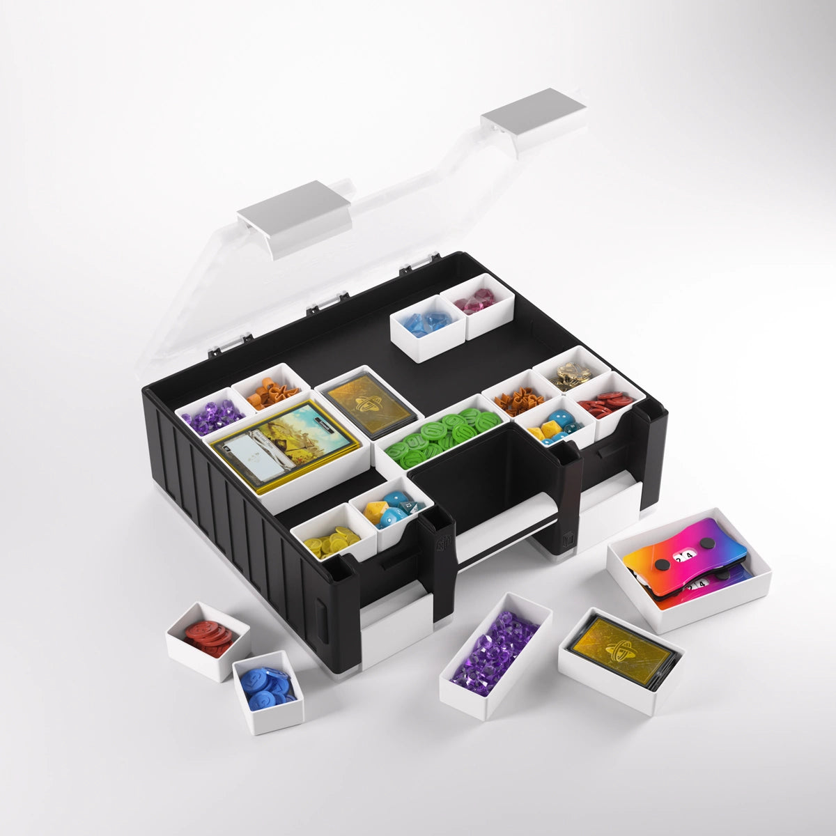 De Game Castle is een perfecte opbergoplossing voor 6 Commander Decks** (6x 100 kaarten met dubbele sleeve), fiches, dobbelstenen, bewegings-/bereiktools en vele andere game-accessoires! Aan de ene kant van de doos bevinden zich zes uitneembare kaarthouders voor 600 kaarten met dubbele sleeve in dikke binnenhoezen of 800 kaarten met bordspelsleeves. De andere kant biedt plaats aan 19 uitneembare trays in 5 verschillende formaten, waaronder een extra lange tray voor bewegings-/bereiktools, twee trays in Mini-American-kaartformaat en twee in Standard Card Game-formaat. De trays kunnen worden verwisseld met die van de Gamegenic Token Silo en de Token Silo Cards Add-on, waardoor er talloze verschillende maat- en kleurcombinaties mogelijk zijn. Het innovatieve clipmechanisme zorgt voor een nauwkeurige en veilige sluiting.