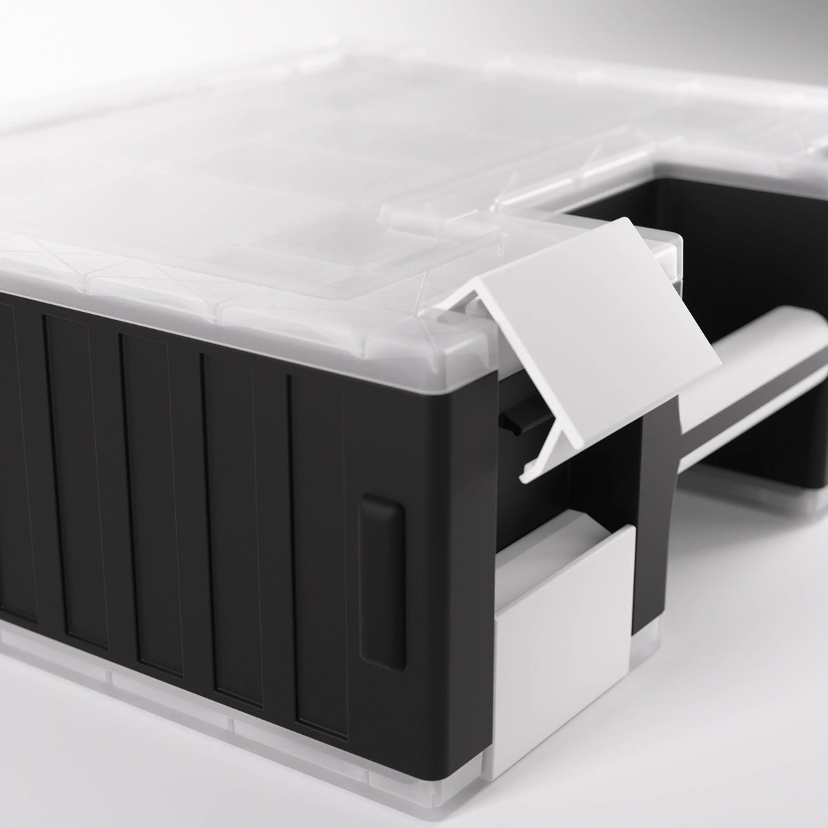 The Game Castle is a perfect storage solution for 6 Commander Decks** (6x 100 double-sleeved cards), tokens, dice, movement/range tools, and many other gaming accessories! One side of the box houses six removable card holders for 600 double-sleeved cards in Thick Inner Sleeves or 800 board-game-sleeved cards. The other side holds 19 removable trays in 5 different sizes, including an extra-long tray to store movement/range tools, two trays in Mini-American card size, and two in Standard Card Game size. The trays can be swapped with those from the Gamegenic Token Silo and the Token Silo Cards Add-on, offering many different size and color combinations. The innovative clip mechanism ensures precise and secure closure.