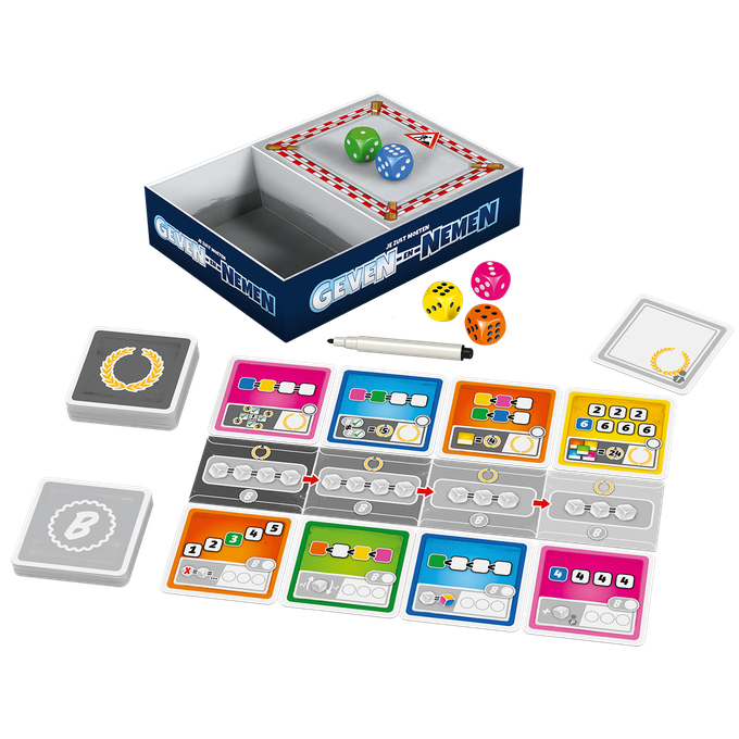In dit dobbelspel probeer je de door jouw geworpen dobbelstenen slim in te zetten om een zo hoog mogelijke score te behalen. Tot zo ver niets nieuws toch? Bij Geven & Nemen heb je echter geen standaard scorevel, maar maak je dat zelf door in jouw beurt een van de kaarten van tafel te kiezen. Zo stellen alle spelers in de loop van het spel hun eigen, unieke speelveld samen. Kies de juiste combinatie van kaarten om je score te maximaliseren.