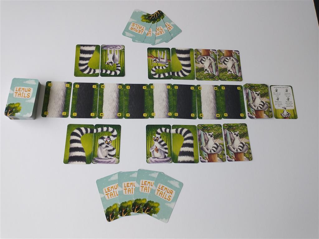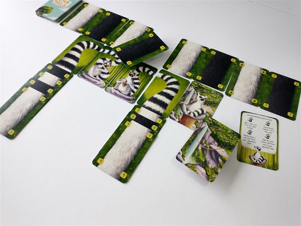 Lemur Tails is een kaartspel voor twee spelers waarin je probeert de langste staart te maken door zwarte en witte staartkaarten af te wisselen. Hoe langer de staart, hoe beter. Klinkt makkelijk genoeg, maar je maakt allebei twee staarten en wint als jouw kortere staart langer is dan die van je tegenstander. Gebruik dus de genummerde staartkaarten om twee lange staarten te maken en maak strategisch gebruik van de jokerkaarten en de zonaanbiddende maki's. Alleen als je deze factoren combineert, kun je de langste korte staart maken en winnen.