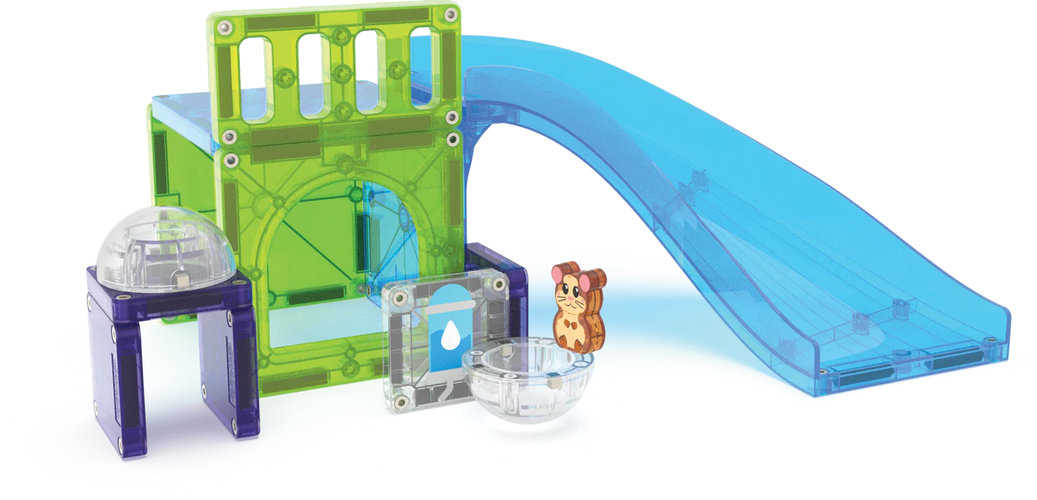 De MAGNA-TILES Hamster Ball set is speciaal ontworpen met een rollende magnetische hamsterbal, een dynamisch glijbaanelement en een schattige hamster – voor nog meer beweging en fantasierijk spelplezier.
