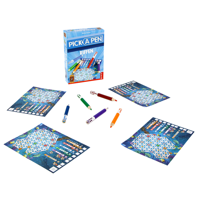 Pick-a-Pen: Riffen is een spel uit de Pick-a-Pen-serie van de gerenommeerde auteur Reiner Knizia en bevat scorevellen van 3 oplopende niveaus. Op scorevellen 2 en 3 vind je draaikolken en propellers die je op verschillende manieren bij het inkleuren van routes kunnen hinderen of juist helpen.