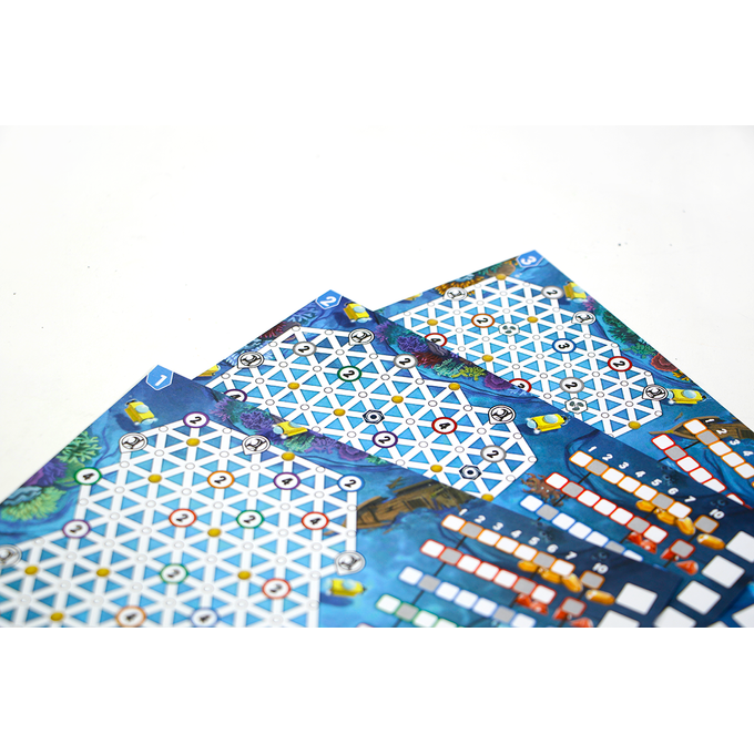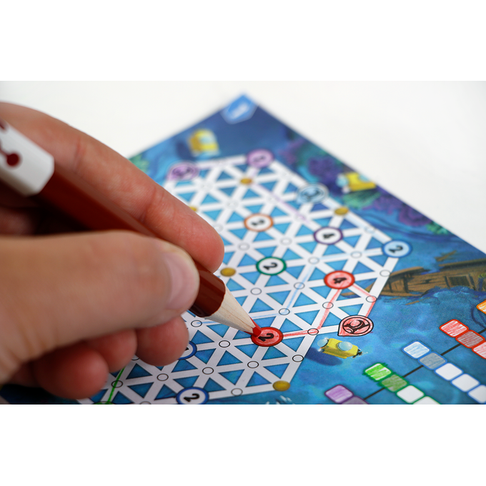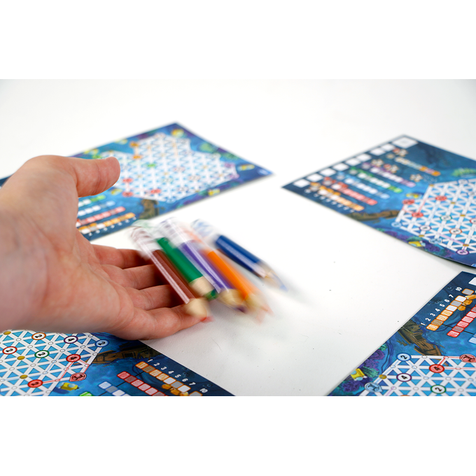 Je hebt ieder een scorevel van hetzelfde niveau, waarop je vanaf verschillende duiklocaties routes inkleurt. De startspeler rolt eerst alle potloden, die elk een verschillende kleur hebben. Op de zijden ervan staan verschillende symbolen. Die laten zien uit hoeveel stappen de route bestaat die je op je scorevel mag inkleuren.