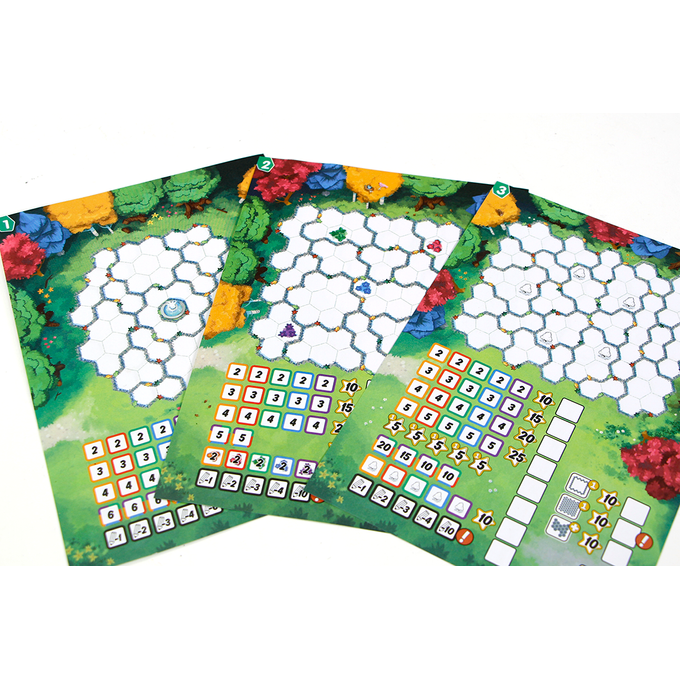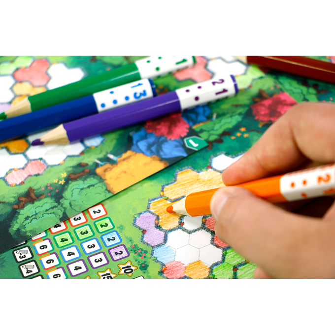 Je hebt ieder een scorevel van hetzelfde niveau, waarop je omkaderde tuinen inkleurt. De startspeler rolt eerst alle potloden, die elk een verschillende kleur hebben. Op de zijden ervan staan verschillende getallen. Die laten zien hoeveel vakjes je in die kleur op je scorevel mag inkleuren.