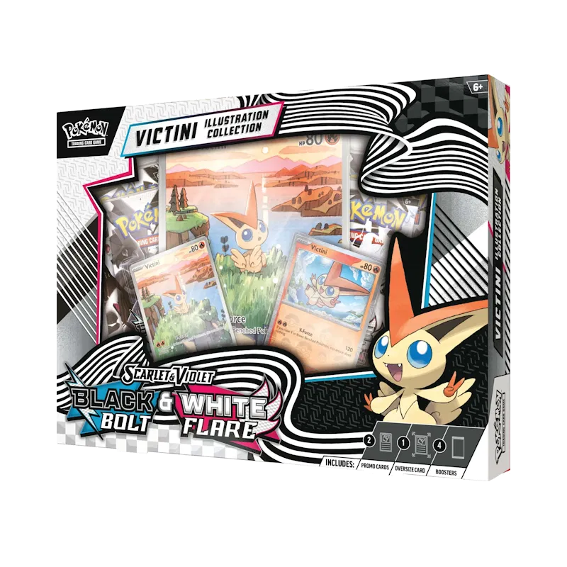 De Mythische Pokémon Victini zou oneindige energie creëren die hij met zijn vrienden kan delen, en nu kun je met hem samenwerken in je eigen Pokémon TCG-decks! In deze collectie krijg je een zeldzame folie-promokaart met illustraties en een premium parallelle foliekaart met Victini, plus een extra grote kaart om tentoon te stellen. Je vindt nog meer Pokémon uit de Unova-regio in de meegeleverde boosterpacks van de speciale uitbreidingen Scarlet & Violet—Black Bolt en Scarlet & Violet—White Flare.