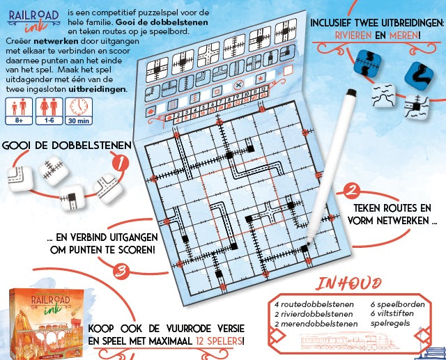 Railroad Ink is een competitief puzzelspel voor de hele familie. Gooi de dobbelstenen en teken routes op je speelbord. Creëer netwerken door uitgangen met elkaar te verbinden en scoor daarmee punten aan het einde van het spel. Maak het spel uitdagender met één van de twee ingesloten uitbreidingen: rivieren en meren (blauw).