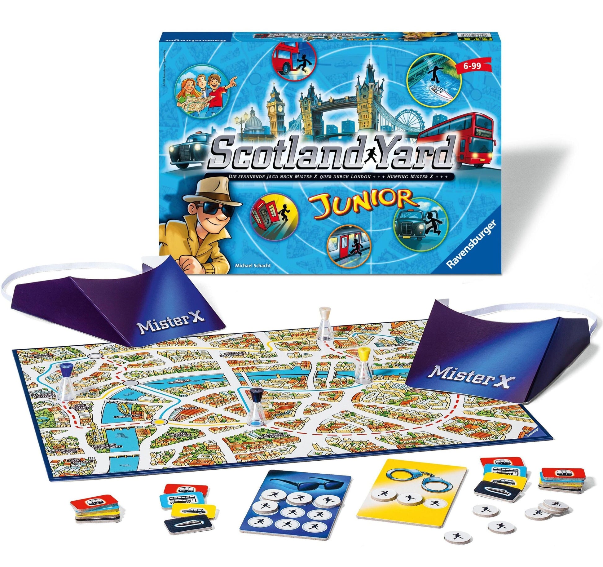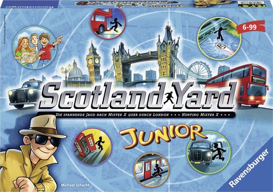 Scotland Yard Junior, Samen jagen de slimme detectives op Mister X kris kras door Londen. Raden zij waar z´n volgende vluchtpoging naar toe gaat- Of is Mister X ze weer te slim af? Scotland Yard- Eenvoudige regels, korte spelrondes en spannend tot het eind!