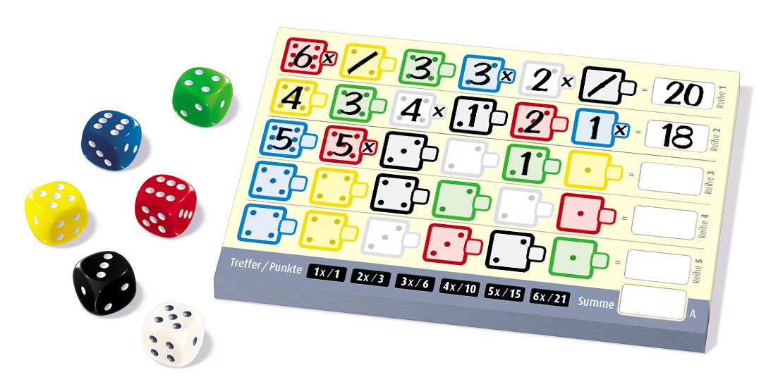 In Twenty one Iedere speler krijgt een verschillend scoreblad (er zijn zes verschillende) en een pen (niet inbegrepen). Tip! Gebruik een viltstift of pen zodat je de ingevulde getallen goed kunt lezen. Op elk scoreblad staan vijf horizontale rijen. De verdeling van de getallen op elk scoreblad is dezelfde, maar de verdeling van de kleuren is steeds anders. De rijen moeten één voor één van boven naar beneden en na elkaar worden gevuld. Iedere speler moet dus eerst zijn bovenste rij compleet vullen en waarderen, daarna zijn tweede rij compleet vullen en waarderen, enz.