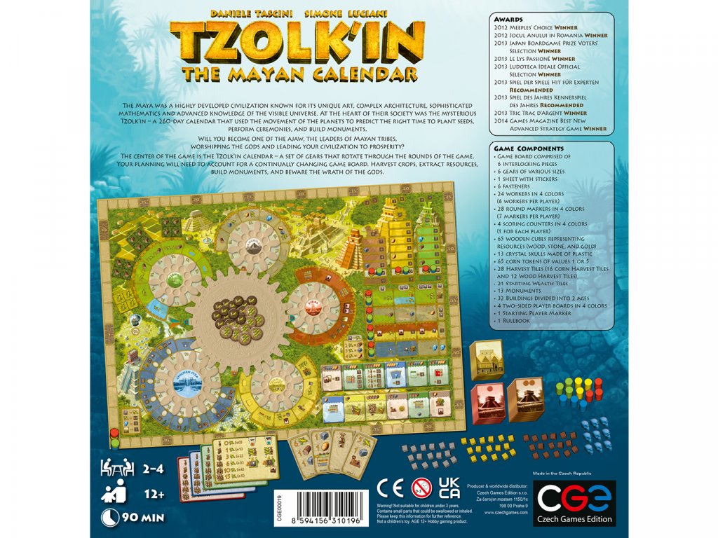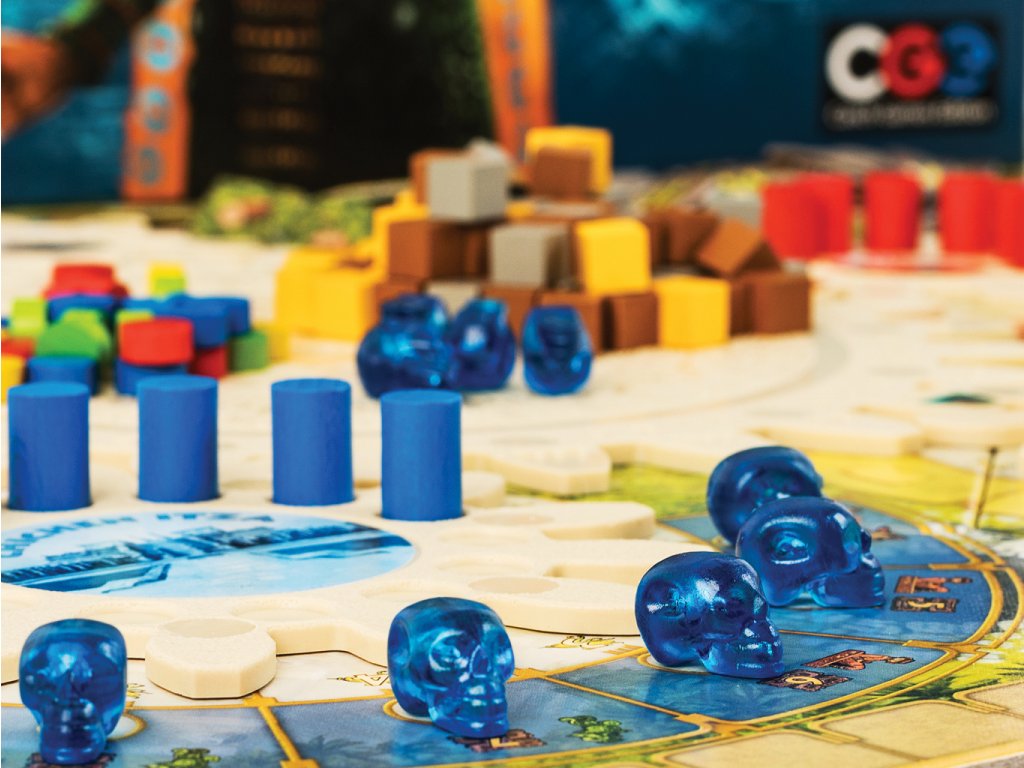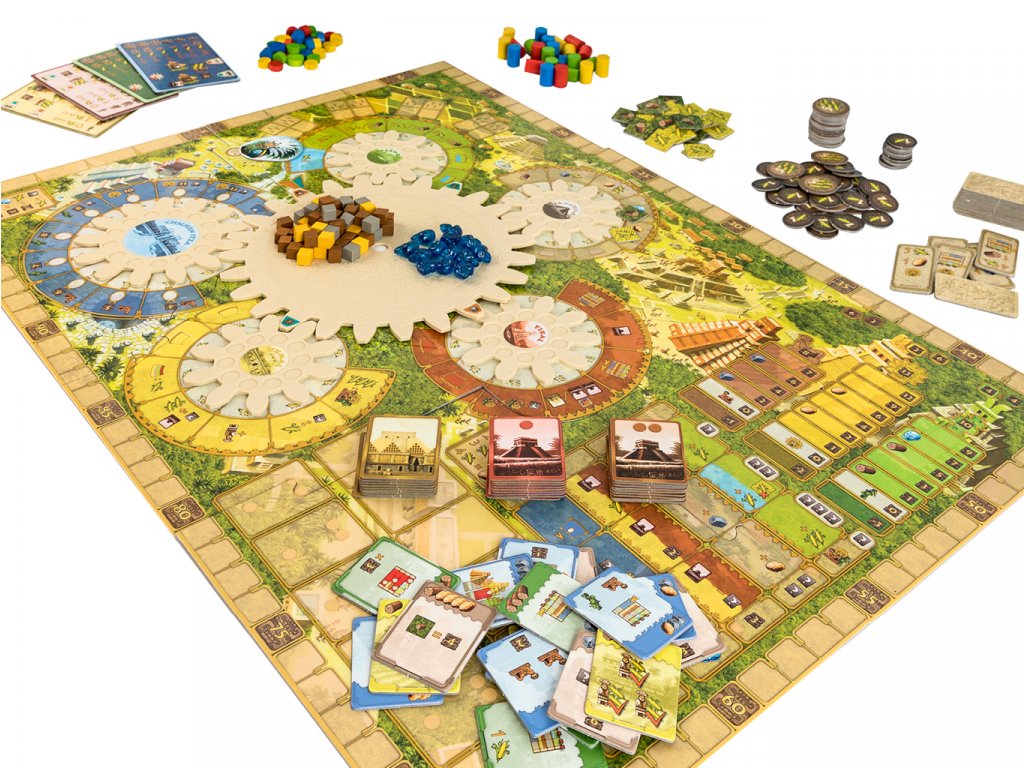 The game ends after one full revolution of the central Tzolk'in gear. Construct many bulidings, or please the gods by placing crystal skulls in deep caves. These are just two of the many paths to victory!