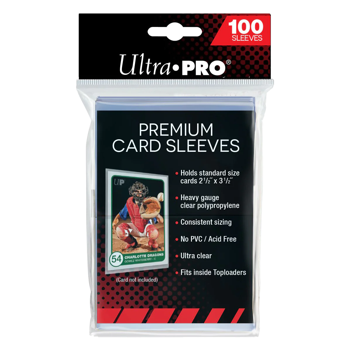 Keep your collectible trading cards safe and protected for storage, sorting, and trading with Ultra PRO's Premium Card Sleeves. These sleeves are made in California, USA, and thicker than our Penny Sleeves (SKU 81126) for added protection. Produced with archival-grade, acid-free, non-PVC, and ultra-clear polypropylene film, these premium card sleeves are designed to hold standard size 2.5" x 3.5" trading cards up to 35PT in thickness and are ideal for use with Ultra PRO's Toploaders. Each pack comes with 100 individual sleeves per pack.