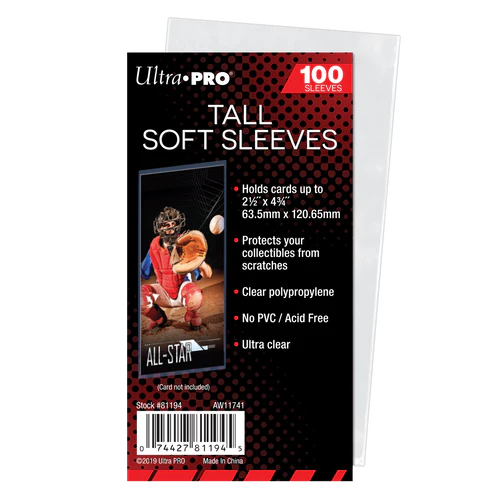 Archival-grade, acid-free, and non-PVC premium card sleeves designed to hold tall 2-1/2" x 4-3/4" cards. Ideal for use with matching size toploaders. 100 count per pack.